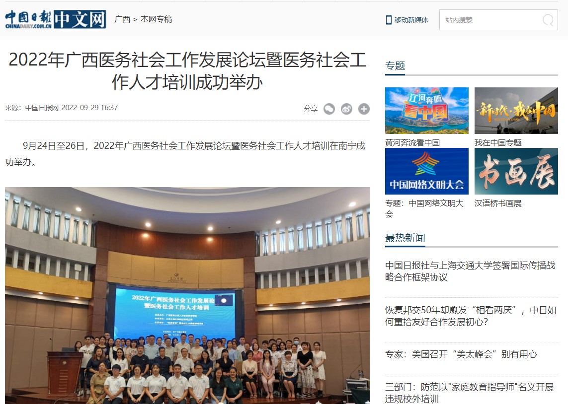 2022年9月29日,人民网、中国日报网、中国网等多家媒体报道由我校dg百家乐 主办的2022年广西医务社会工作发展论坛暨医务社会工作人才培训。