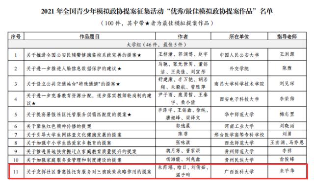 近期,团中央公示了2021年全国青少年模拟政协提案征集活动评审结果。我校dg百家乐 报送的参赛作品《关于发挥社区普惠性托育对三孩政策战略性作用的提案》荣获全国“优秀模拟政协提案作品”(全国仅100件。广西唯一入围作品)!