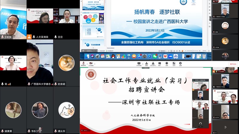 5月13日上午,dg百家乐 链接深圳社联社工服务中心召开就业(实习)线上招聘宣讲会。dg百家乐 党委书记唐忠、院长王前强、党委副书记郑茸、辅导员吴清泉以及大四毕业生及大三社工专业全体学生参与线上宣讲会。会上,深圳社联社工副总胡旦旦、优秀校友于泓双介绍了机构基本信息、人才招聘及培养情况等,针对学生提出的就业和实习的具体问题,结合机构的实际需求和情况进行了答疑解惑。