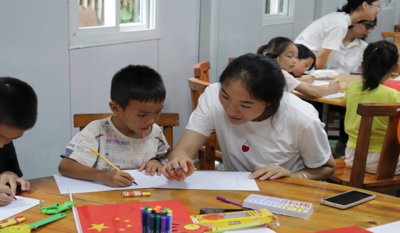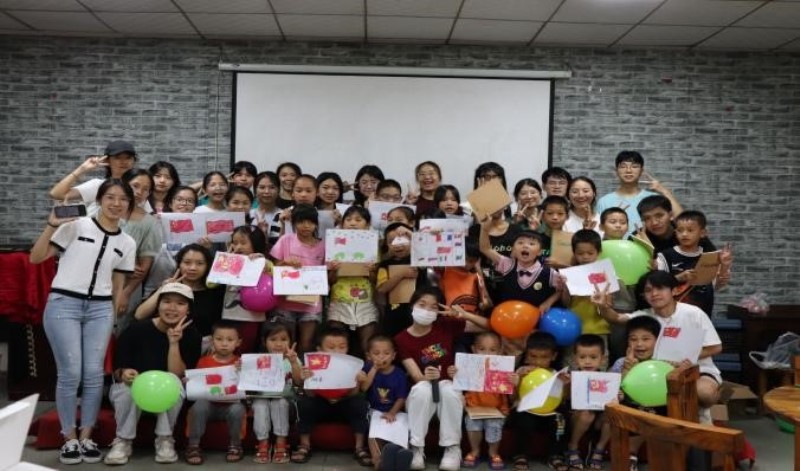 图8 大学生志愿者与小朋友们共绘国旗
