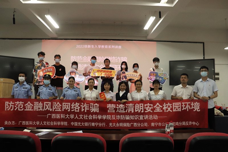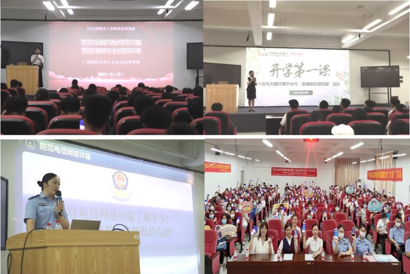 为提升学生金融素养及风险防范能力,9月17日,dg百家乐 在武鸣校区报告厅举办了2场“防范金融风险网络诈骗,营造清朗安全校园环境”新生主题教育活动。活动邀请了光大银行南宁分行、光大永明保险广西分公司的讲师,及南宁市公安局武鸣分局反诈中心的警官们到场宣讲,辅导员和新生400余人参加活动。